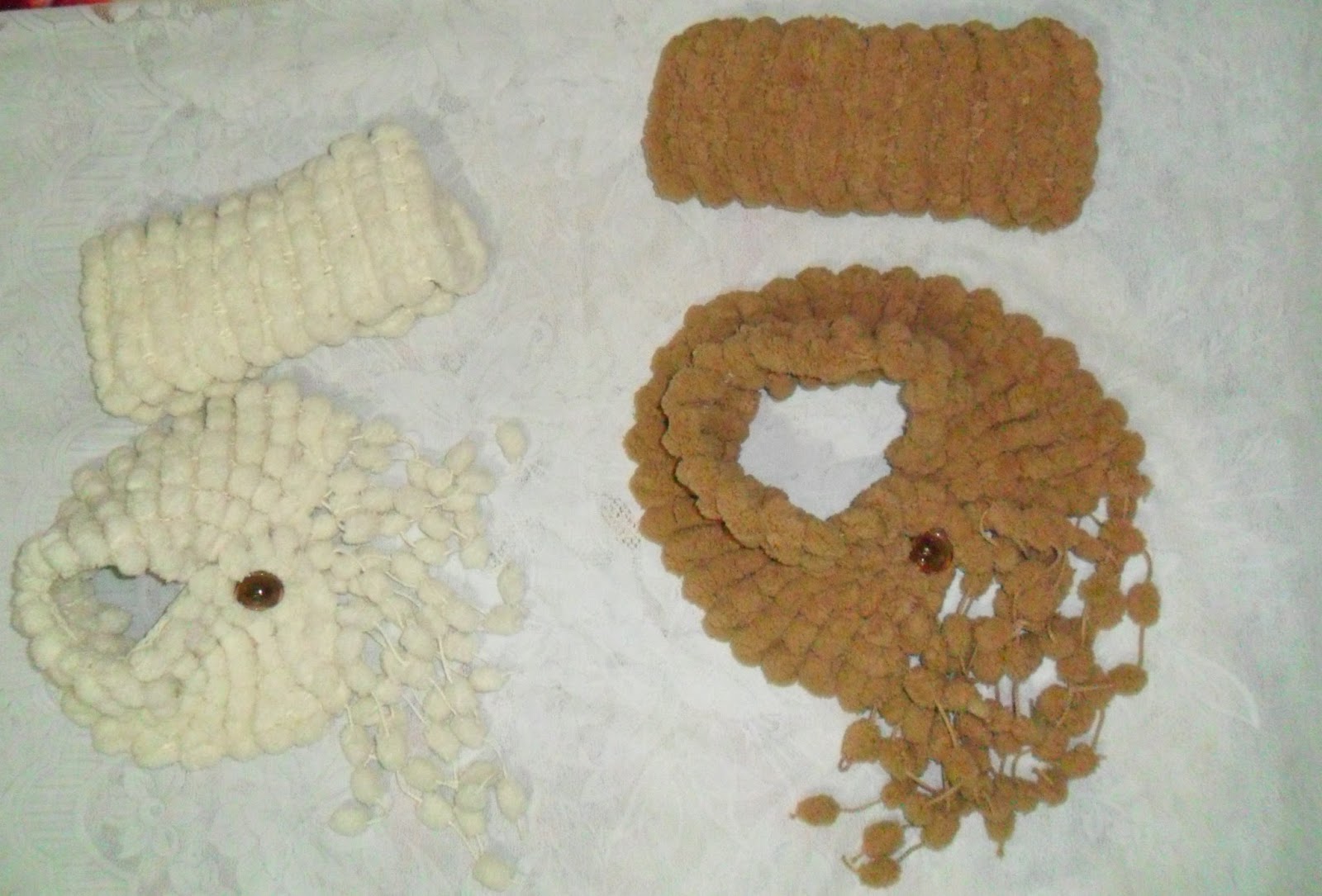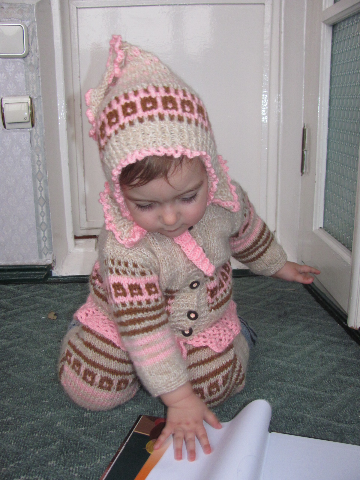 Tricotarea acestui costumaş mi-a adus multe emoţii pozitive din mai multe considerente...În faţă aveam aţa,căpătată prin despletirea puloverului meu din mohair, care se transformase in pîslă după spălare, nişte rămăşiţe de aţă din lînă de culoare maro şi dorinţa să tricotez ceva fain pentru nepoţica mea. Deci, am cumparat un scul nou de culoare roz din mohair nu prea pufos şi am început să experimentez...