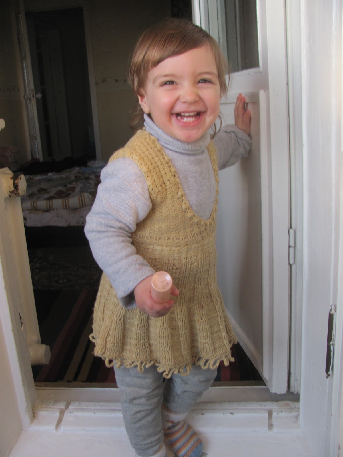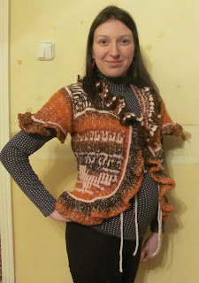 Am numit această tunică ”Fantezie” , fiindcă am confecţionat-o din aţă din lână de diferite culori, care la început nici cum nu se lăsau combinate. Este vorba de un fir buclat , colorat în mai multe nuanţe , cam ”mîhnite”. Aţa de culoare roz am folosit-o ca să mai ”înveselesc” tunica. Nurorii i-a placut!