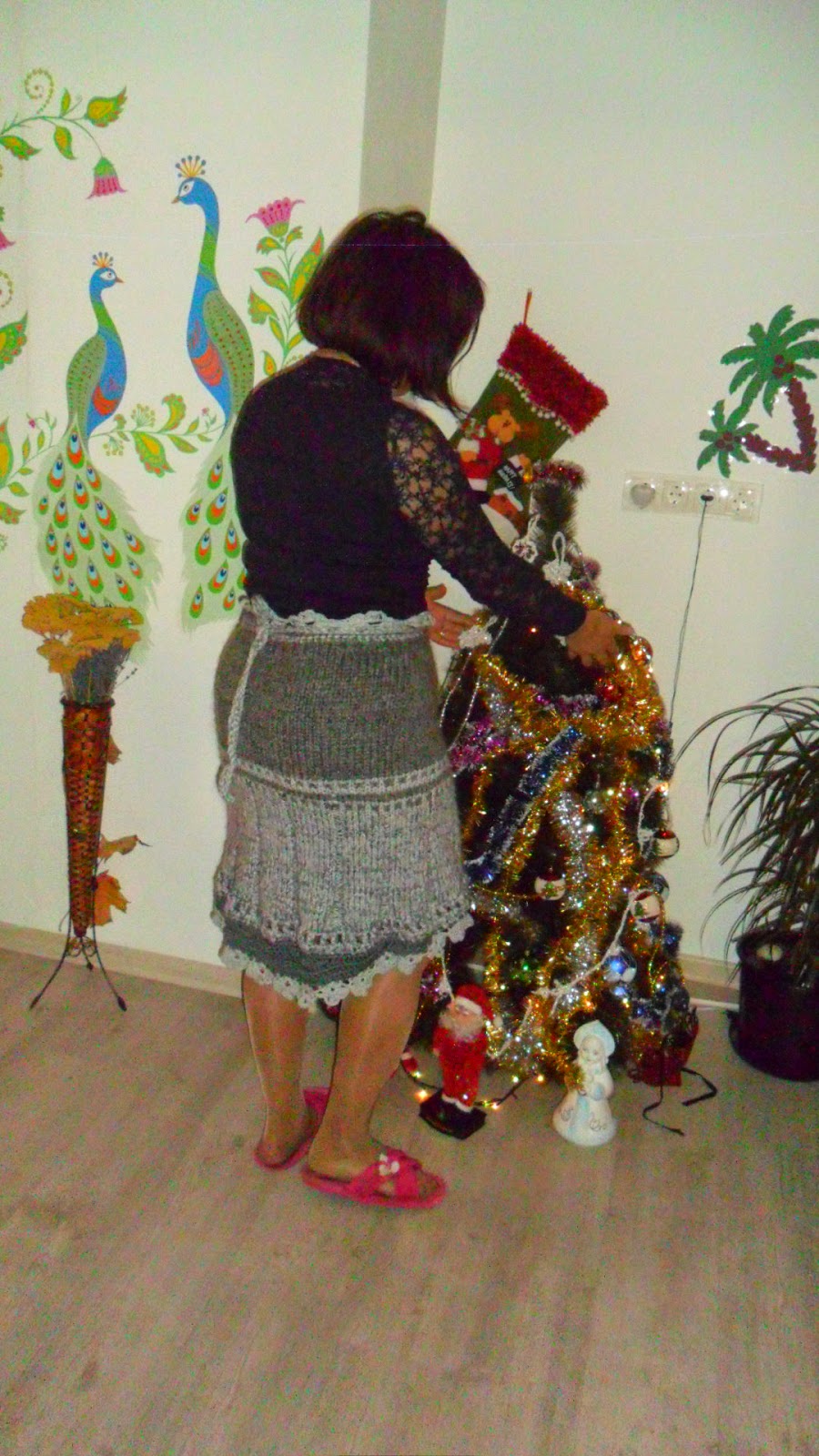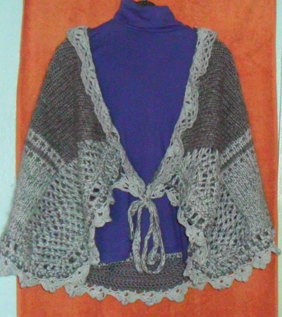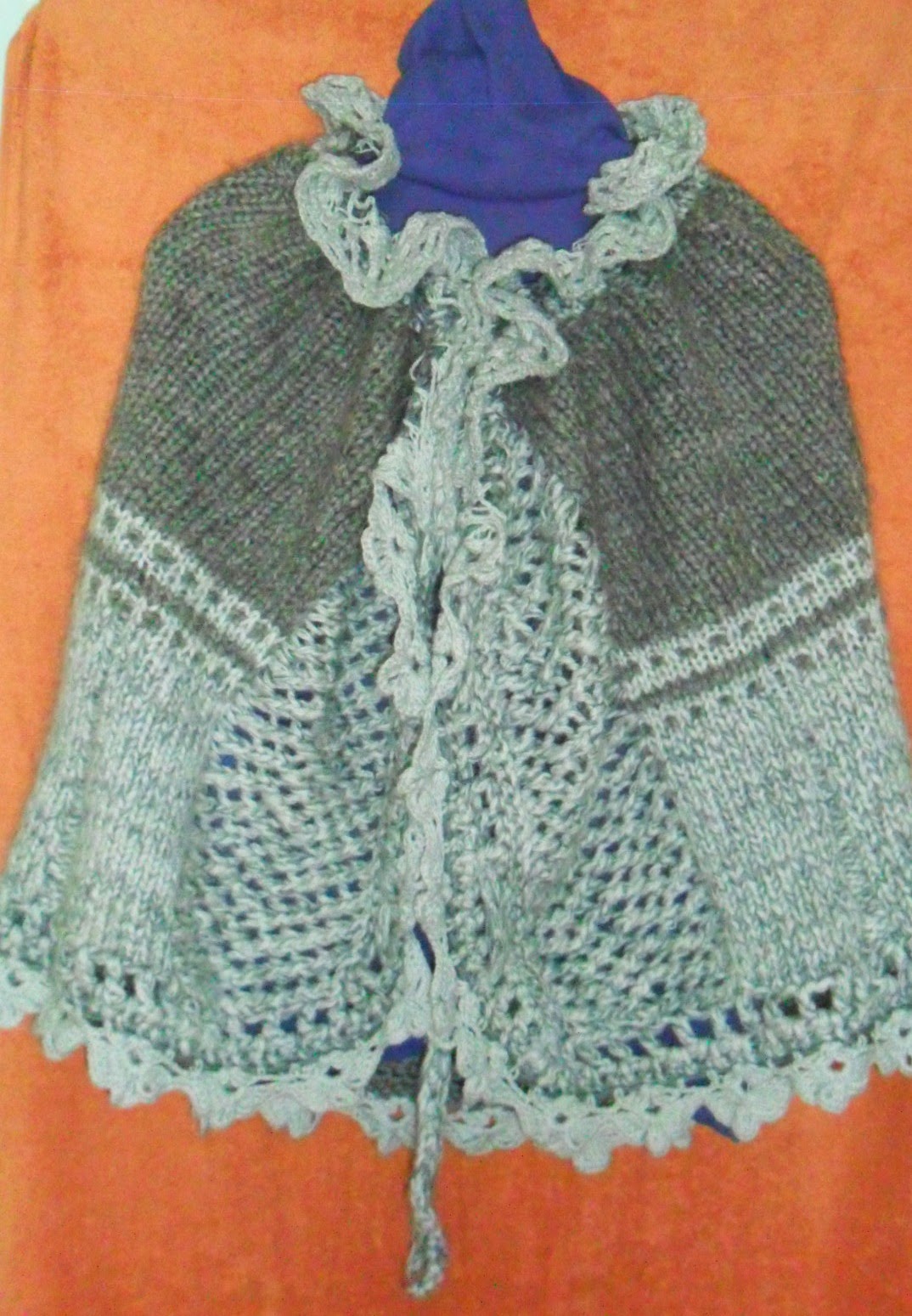 Eu de fapt, începusem să îmi croșetez o vestă obișnuită cu mâneci, însă după ce am tricotat vreo 4 rânduri de flori(imaginea din stânga), am descoperit, că am greșit mărimea și începusem dezamăgită să despletesc ce făcusem, ca să încep din nou. Întâmplător am întors pânza cu florile în jos(imaginea din dreapta) și am descoperit uimită, că ornamentul cu florile în jos se privește în cazul dat, la culoarea și grosimea aței, mai special, iar tiparul în formă de trapez este anume acela, care mie cel mai bine îmi stă. Deci, am început să îmi inventez o altă haină și iată că mi-a eșit această tunică, mai specială decât vesta clasică, la care mă gândeam. Concluzia: dacă nu vă place ceva din ce lucrați cu mânuțele voastre de aur, stimate doamne meșterițe, nu vă grăbiți la stricat, priviți bine la ce vi s-a primit și vedeți, ce idee vă sugerează Muza inspirației.