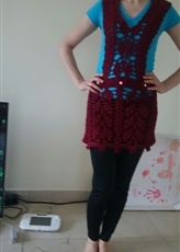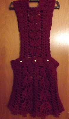 Pentru sarafan nu am avut un model aparte, am croșetat la ochi, după intuiție. Repere au fost dorința, să nu fie cu bată la talie, să se poată purta cu bluziță de orice grosime, pe talie, sau cu talia joasă. Să se poată purta pe o căptușeală de o singura culoare ca haină elegantă, sau peste pantaloni pe picior(lasine) ca pînză decorativă. Am vrut să creez o haină originală multifuncțională și ma bucur, că mi-a reușit. Și, ca să fie mai interesant, am creat și niște bijuterii croșetate, tot multifuncționale-ca mergele, cercei, colier, floricele pentru cuafură, etc., etc.