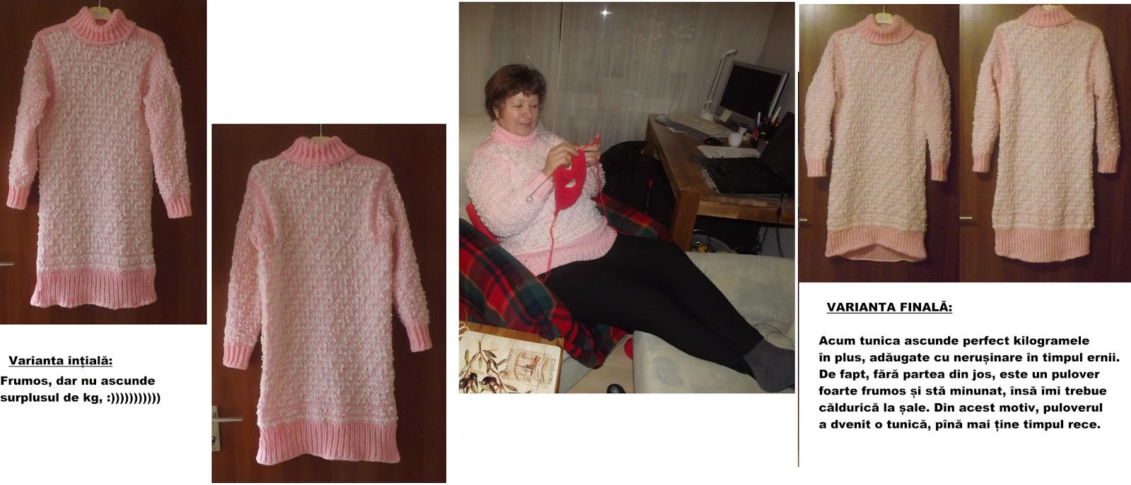 Am luat 60 ochiuri total, am tricotat după cum se vede în imagine-simplu, scăzând la antibraț cîte 9 ochiuri odată la partea din față și cîte 7-la partea din spate. La guler am luat 57 ochiuri. La mâneci-tot cîte 60 ochiuri și am tricotat drept 5-6 cm, apoi am inceput să scad la fiecare rînd alb cîte un ochi din fiecare parte, pînă am ajuns la 36 ochiuri. Am mai tricotat după cît cerea lungimea mînecii, apoi am scăzut brusc pînă la 22 ochiuri și am tricotat manjeta. De fapt tunica aceasta trebuia să fie un pulover foarte frumos, fără bata de jos. Însă, pe vreme friguroasă șalele mele au mare nevoie de căldurică, ce m-a determinat să exersez cu bata de la poale, pînă am reușit să îi dau o formă, care să mă arate mai...slabă! :))))))))) Astefel, puloverul meu a devenit tunică, foarte călduroasă, foarte practică, elegantă și îmi este de mare folos.